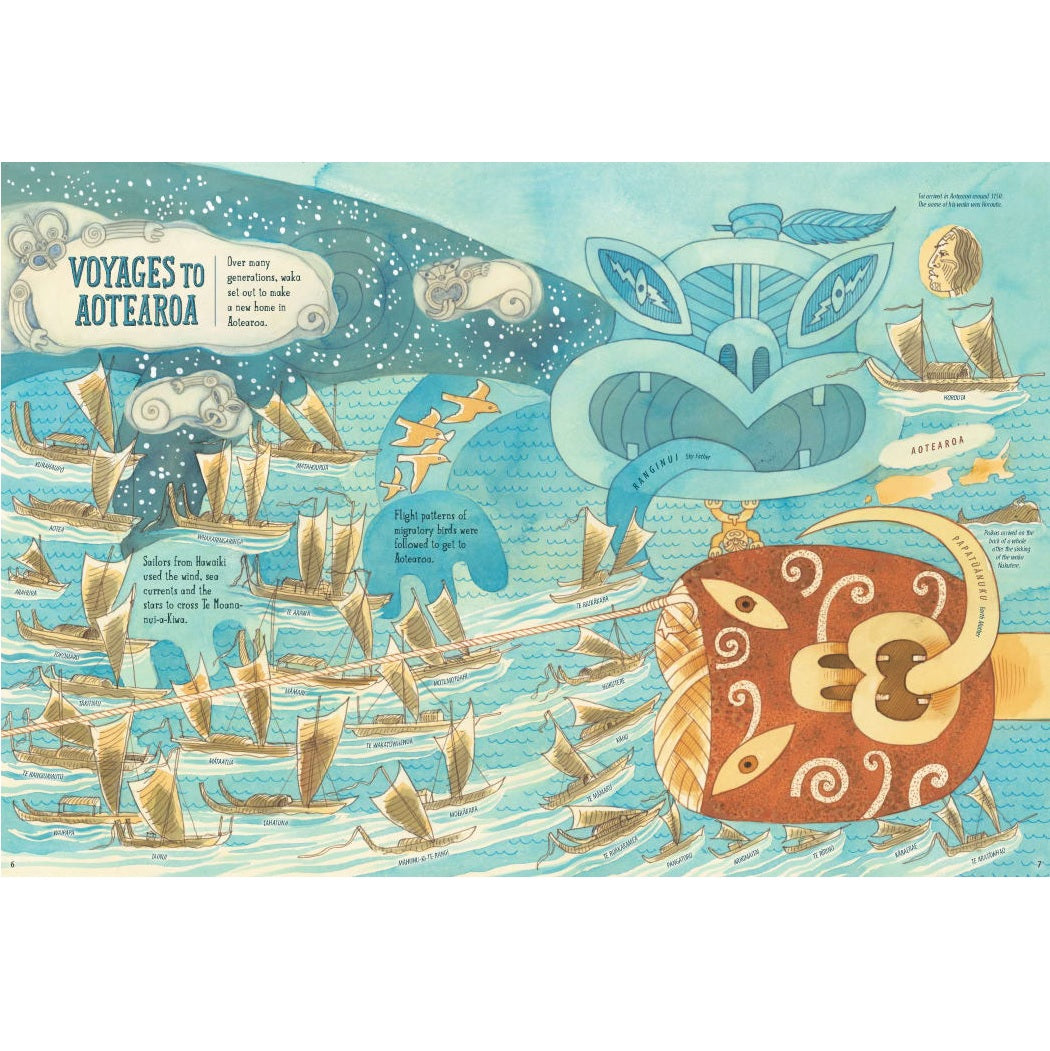Over a thousand years ago, the wind, sea currents and stars brought people to the islands that became known as Aotearoa, the land of the long white cloud. Navigate your way through this sumptuously illustrated story of New Zealand by celebrated children's book creator Gavin Bishop. Explore the defining moments of our history, from the Big Bang right through to what might happen tomorrow. Discover Māori legends, layers of meaning and lesser-known facts. A truly special book, Aotearoa: The New Zealand Story deserves a space on every bookshelf, to be taken off and pored over, thumbed and treasured, time and again.