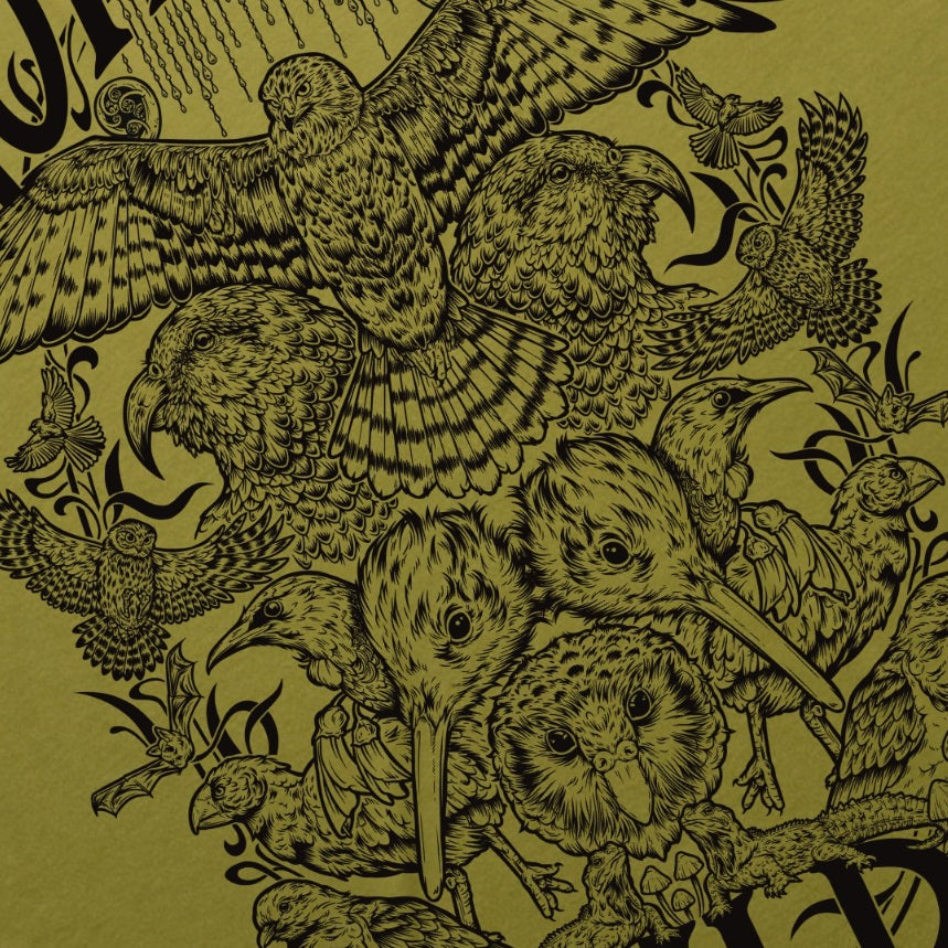 The design features Kākāpō, Kea, Kererū, Takahē, Ruru, Pīwakawaka, Tuatara, Geckos, Kahu, Kiwi, and Tūī...plus native flora and Art Nouveau-inspired detailing and hand lettering on your choice of black with metallic gold ink, or moss green with black ink.