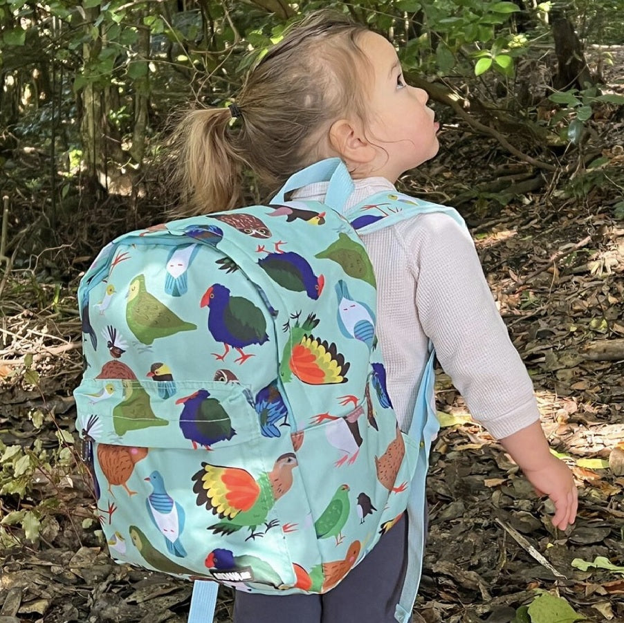 The backpack is a cool mint colour with aqua trim and is covered with cute illustrations of Aotearoa's native birds and creatures.