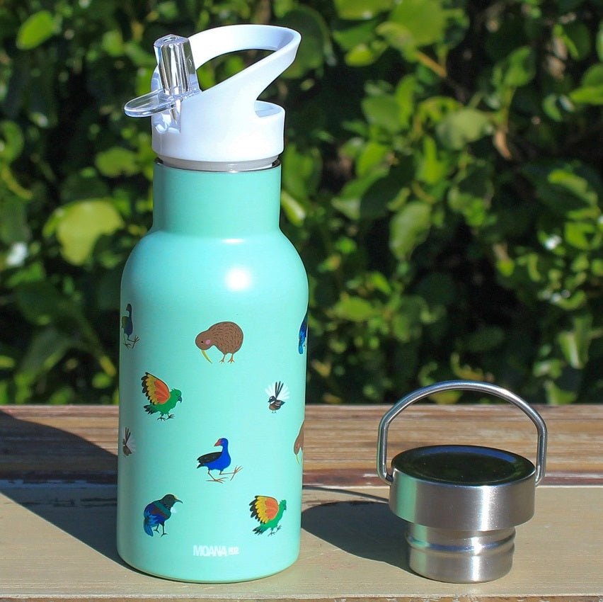 These fun stainless steel drink bottles come in two size options, either 350ml or 500ml. The smaller size comes with two lid options; a straw lid for clean easy drinking, and a stainless steel handle lid (great for if utilising this bottle's thermos action).