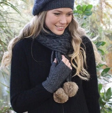 With a stylish cabled detail running up the centre, and an abbreviated fingerless style, these mittens make a great addition to any outfit. Keep your fingers free to operate your phone, key-pad and much more. The luxurious blend of lightweight but warm possum fur, fine merino wool and nylon will keep your hands toastie.
