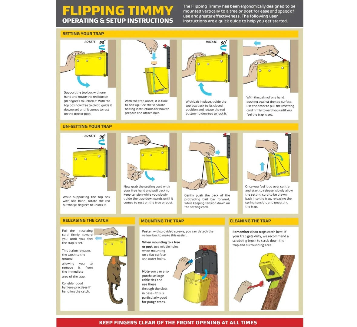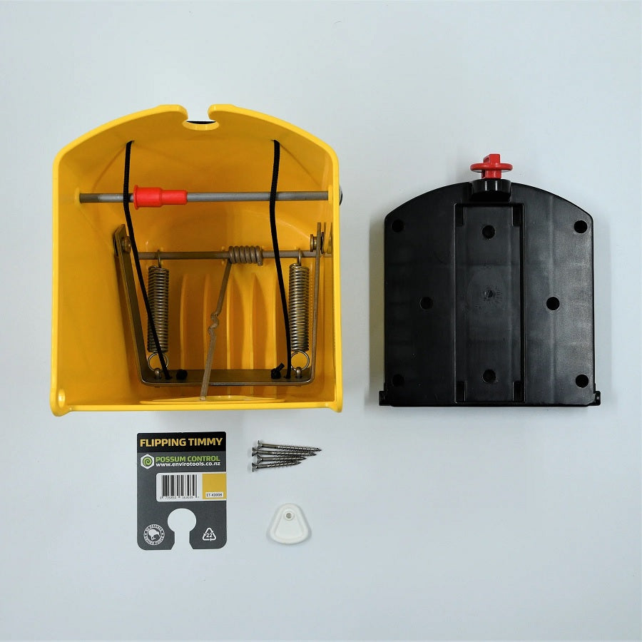 The Flipping Timmy is a mechanical possum trap engineered for optimum results, ease and safety of operation. Designed to be set vertically on a tree or post enables trap to be cleared, rebaited, and reset in seconds, no more bending over to service your trap. Catch hangs clear keeping trap mess free, even if left for some time. Cost effective to bait and maintenance free. All metal parts are stainless steel. Strong springs and fine setting feature - which increases the sensitivity of the trap to ensure full range of pests is caught and killed humanely.