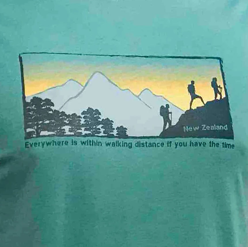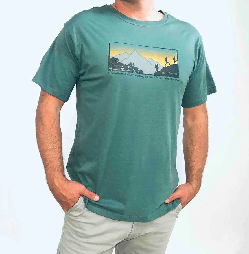 This Mountain printed t shirt by Wild Kiwi features the slogan "Everything is in walking distance if you have the time."