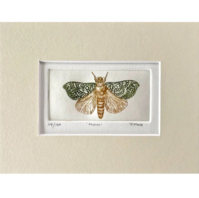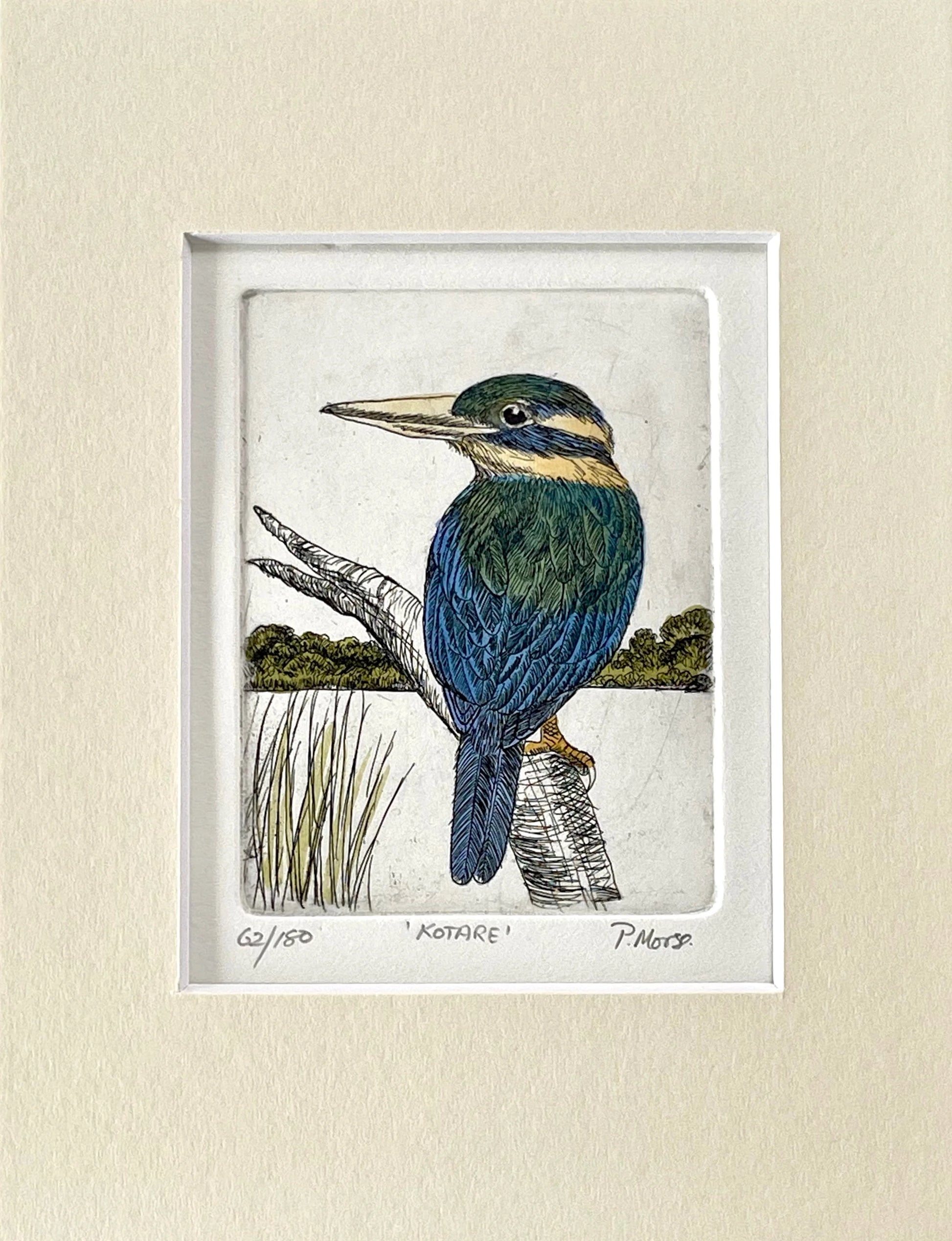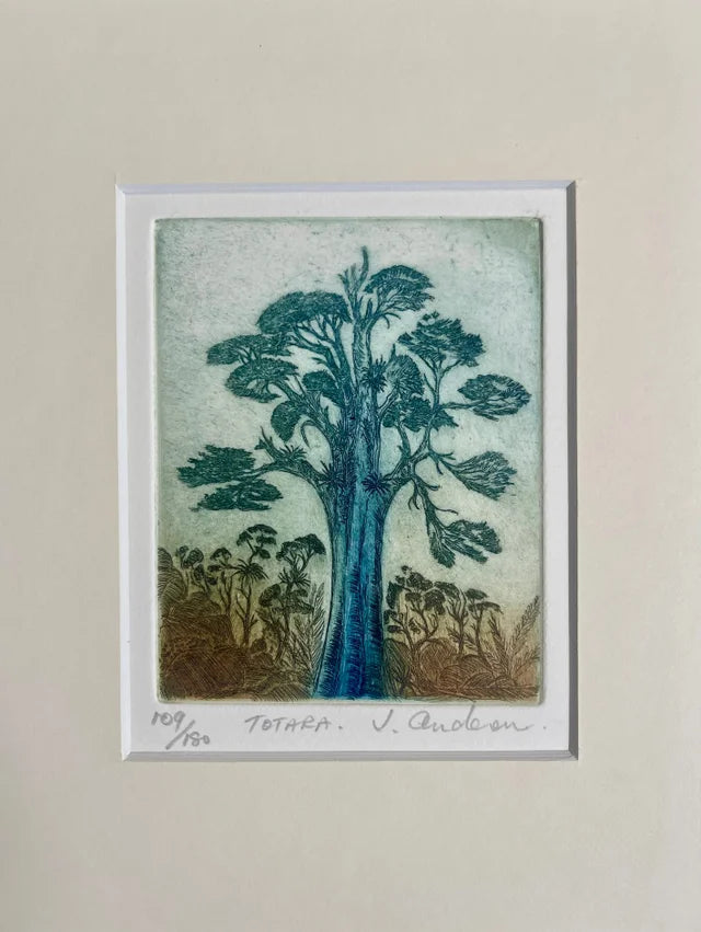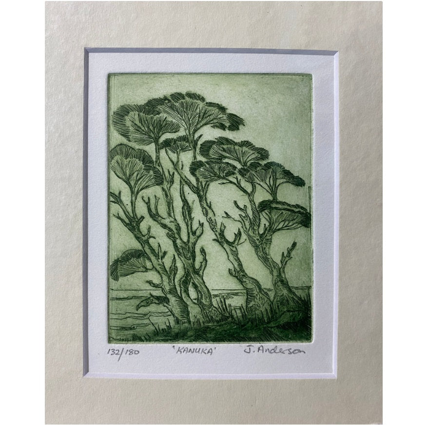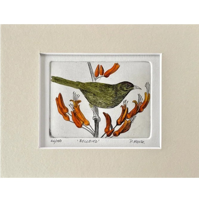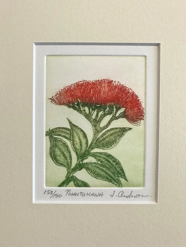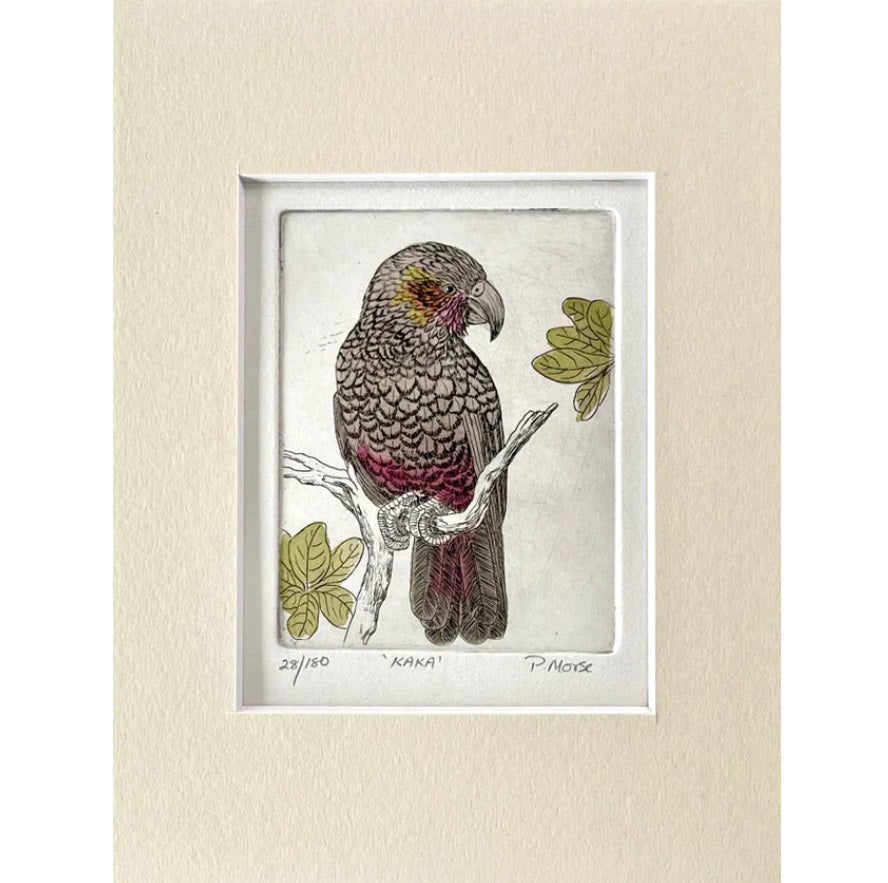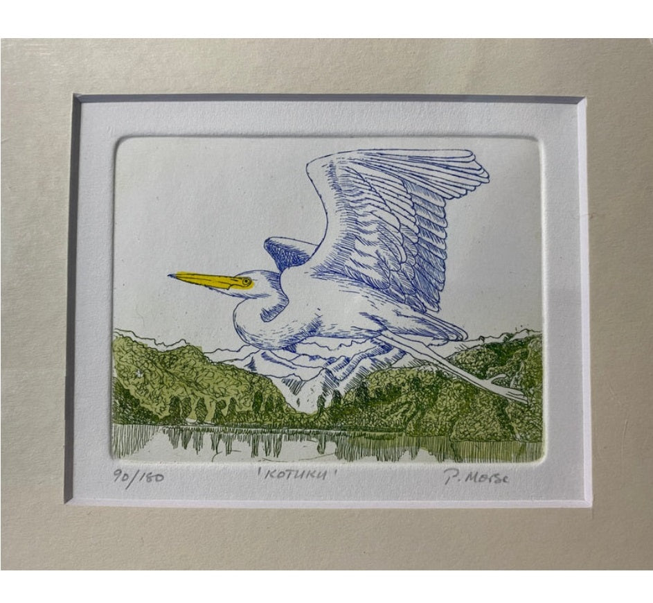Pauline Morse and John Anderson are renowned for producing etchings in the traditional way by drawing through the resin onto a copper plate and etching the image into it with acid. The plate is then finished by hand and passed through a printing press. Each print in the edition is thus a unique artwork. Their images feature iconic New Zealand birds and plants.
