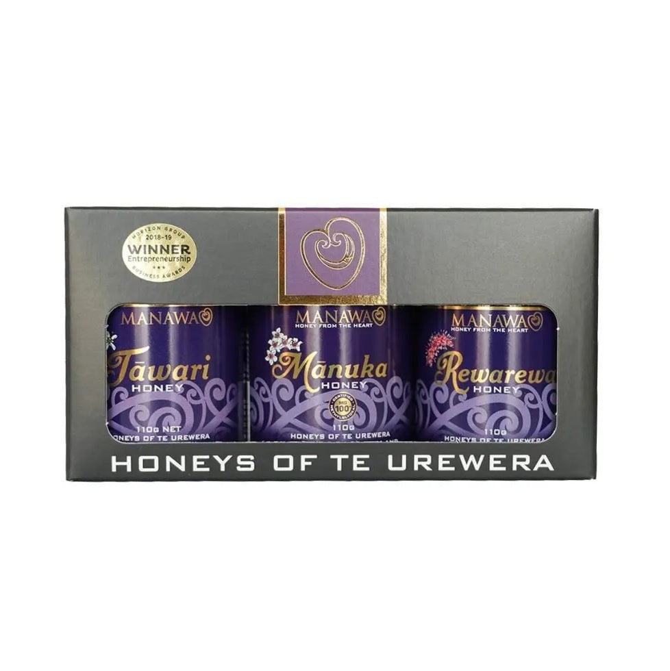 The best gift for honey lovers who can't decide which is their favourite honey variety, this triple pack contains a 110g jar of each of Manawa Honey's most popular honeys; Mānuka MG100+, Rewarewa, and the rare Tāwari.