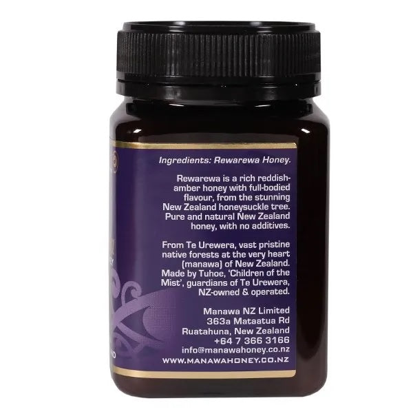 The Rewarewa, an indigenous honeysuckle tree, grows in groves in well-lit parts of the forest of Te Urewera, and stands above the forest shrubbery as a fine tree of up to 30 metres in height. The flowers are clustered together on stalks with about 50-80 flowers in each cluster. The flower is designed for pollination by birds such as kōkō (the Tūhoe name for tūī) and bellbird, so it gives a bounty of nectar found by the bees and made into Manawa's delicious Rewarewa Honey.