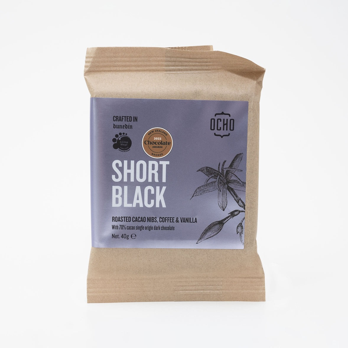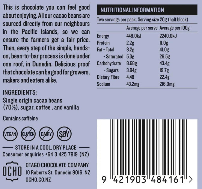 A rich, dark, coffee hit, with crunchy pieces of cacao nib and a hint of sweet vanilla. The coffee beans are supplied from Common Ground in Dunedin.