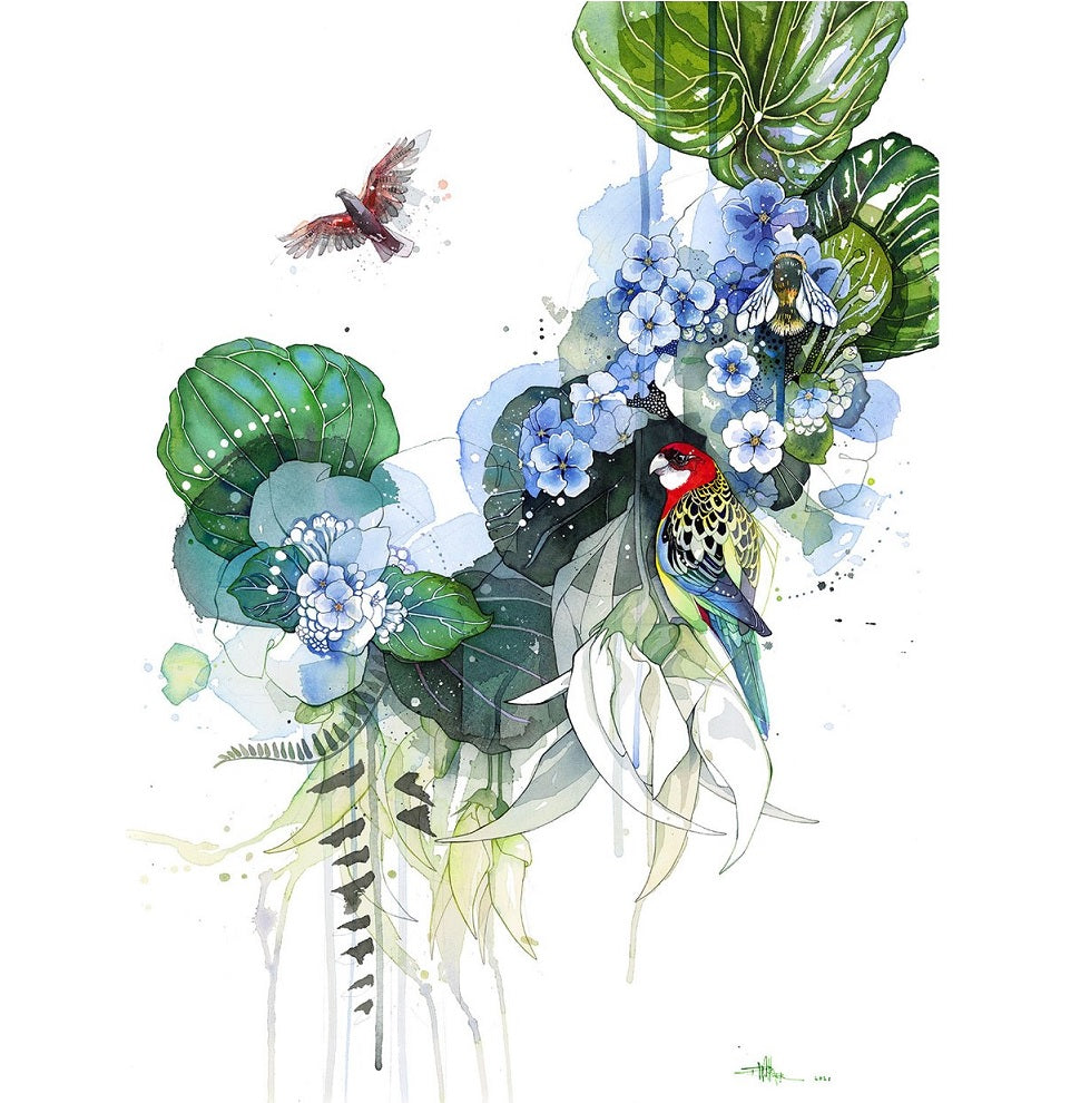 Local Wellington-based artist Rachel Walker is renowned for watercolour, spray paint, pen and ink artworks that draw on her awe of the natural world. Her drippy, energetic style is both loose in form and precisely detailed — capturing the attitude and beauty of birds, sea creatures, reptiles and wild animals.