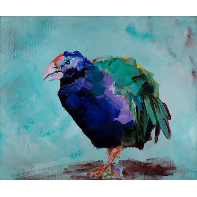 “People see humour in my paintings, which I love.” Shawna’s style uses simple primitive shapes and forms which morph into images that are full of humor and delight. Her subjects leap off the canvas with attitude and a joy of life. Her approach towards her work is almost child-like in its optimism and view of nature and human relationships. She has observed that her paintings make people feel happy, which in turn makes her happy.