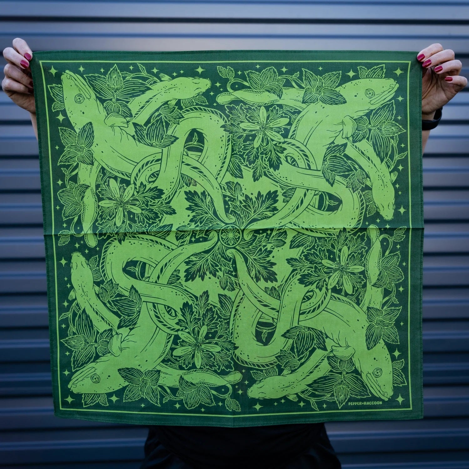 Lose yourself in the stars with Aotearoa's unsung magical creatures, the tuna (longfin eel). This detailed design, by Wellington local Pepper Raccoon, features twisting, interwoven eels amongst native plants of Aotearoa New Zealand's waterways (gratiola and waoriki).