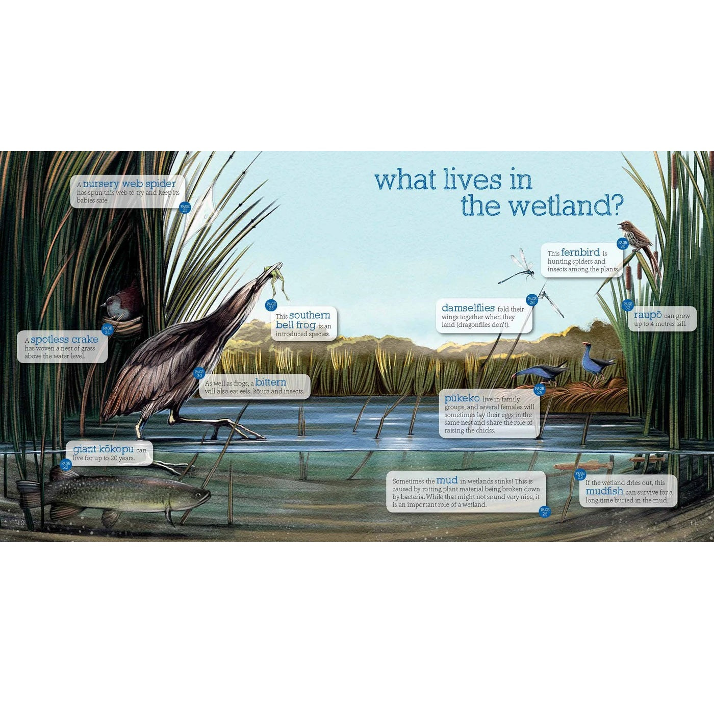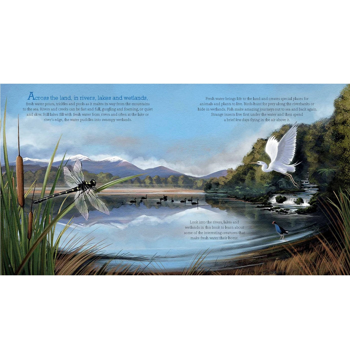 Up the River: Explore & Discover New Zealand's Rivers, Lakes and Wetlands gives children an opportunity to look under the surface and see what special creatures live, around New Zealand's freshwater habitats – our creeks, rivers, lakes and wetlands. Included in this title are animals ranging from the familiar pukeko to the rarely seen bittern, from the iconic eel to tiny whitebait, and some of the many barely known aquatic insects.