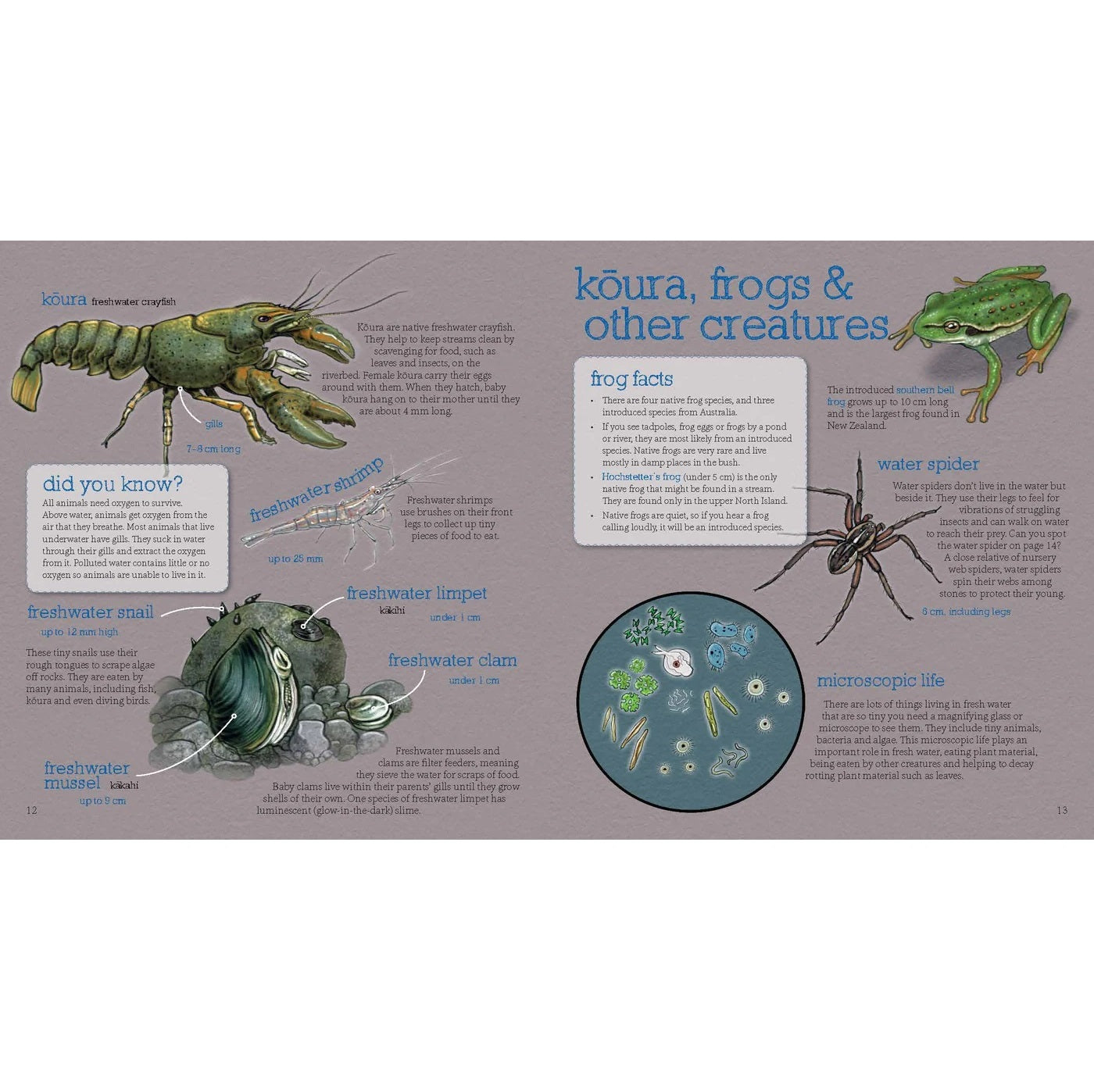 Swimmable and drinkable fresh water are hot topics, and Up the River shows that many native animals depend on healthy waterways for a habitat, and their presence is often used as a sign of the water's health. Beautifully illustrated and impeccably researched, this is a wonderful and intriguing way for children to learn about New Zealand's freshwater environments.