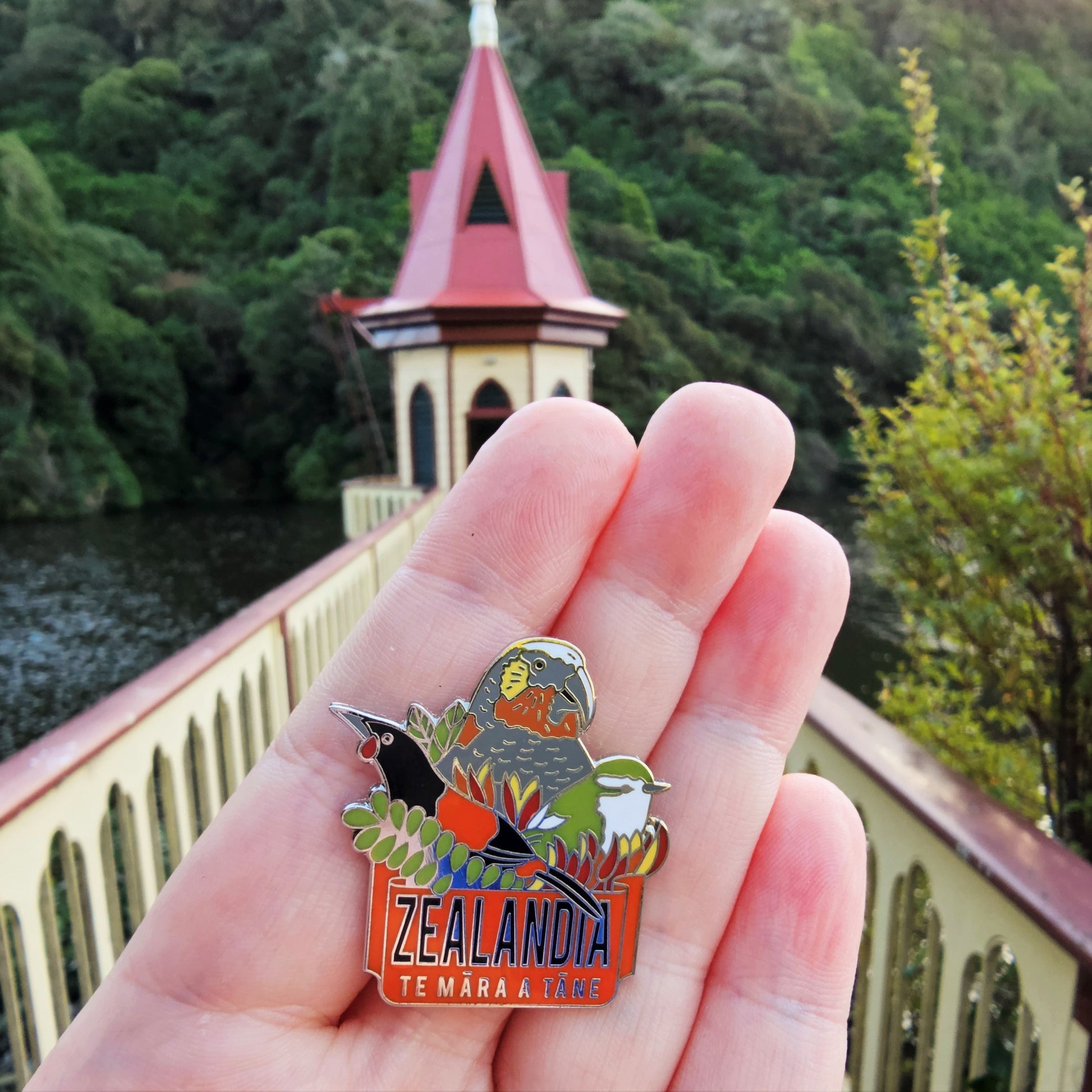This funky enamel pin, made by Wellington designers Natty, feature some of Zealandia's beloved natives.